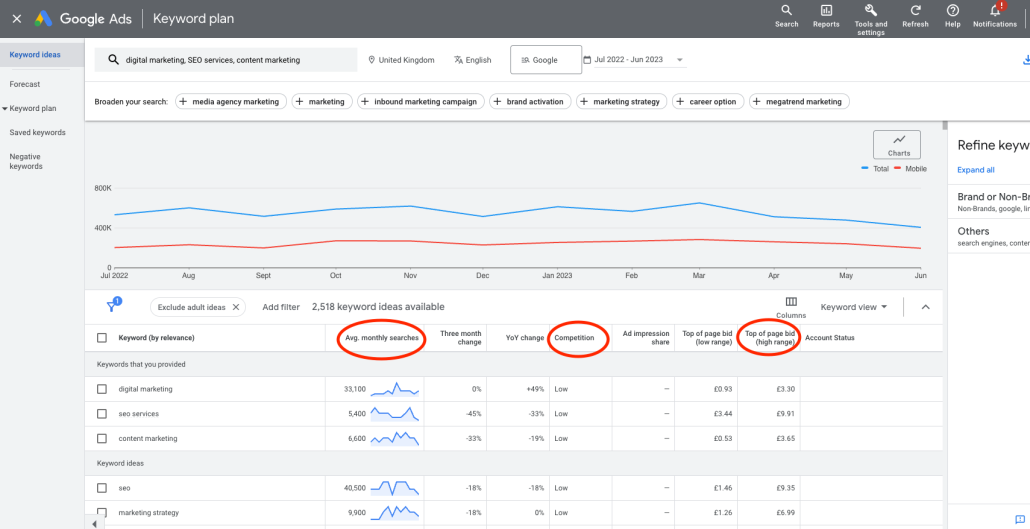 For example, if you run a digital marketing agency like Mass Reach, your seed keywords could be “digital marketing,” “SEO services,” “content marketing,” etc. The planner will then generate a list of keyword ideas related to your seed keywords.