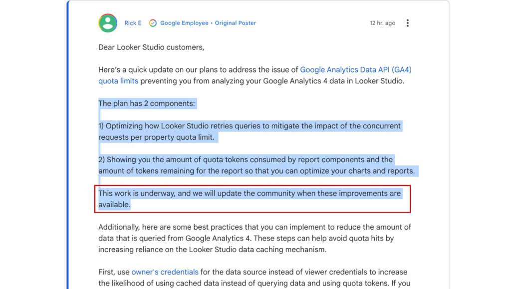 But not all is lost. Rick E from Google posted an update on the Looker Studio help pages stating their plan to address the GA4 quota limit issue. They plan to optimise how Looker Studio retries queries to minimise the impact of the quota limit and also show how many quota tokens are consumed by report components to help optimise your charts and reports.